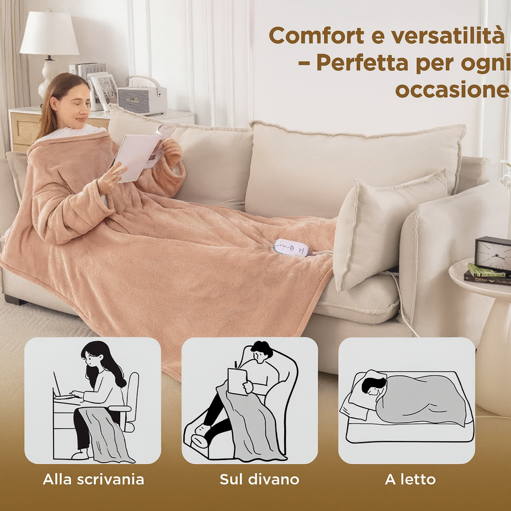 Le coperte tradizionali lasciano braccia, petto e spalle scoperti. La CaldLuxe Robe ha maniche ampie e morbide, così puoi scrivere, scorrere il telefono, giocare, leggere o lavorare senza perdere calore. Rimani completamente avvolto mantenendo le mani libere.